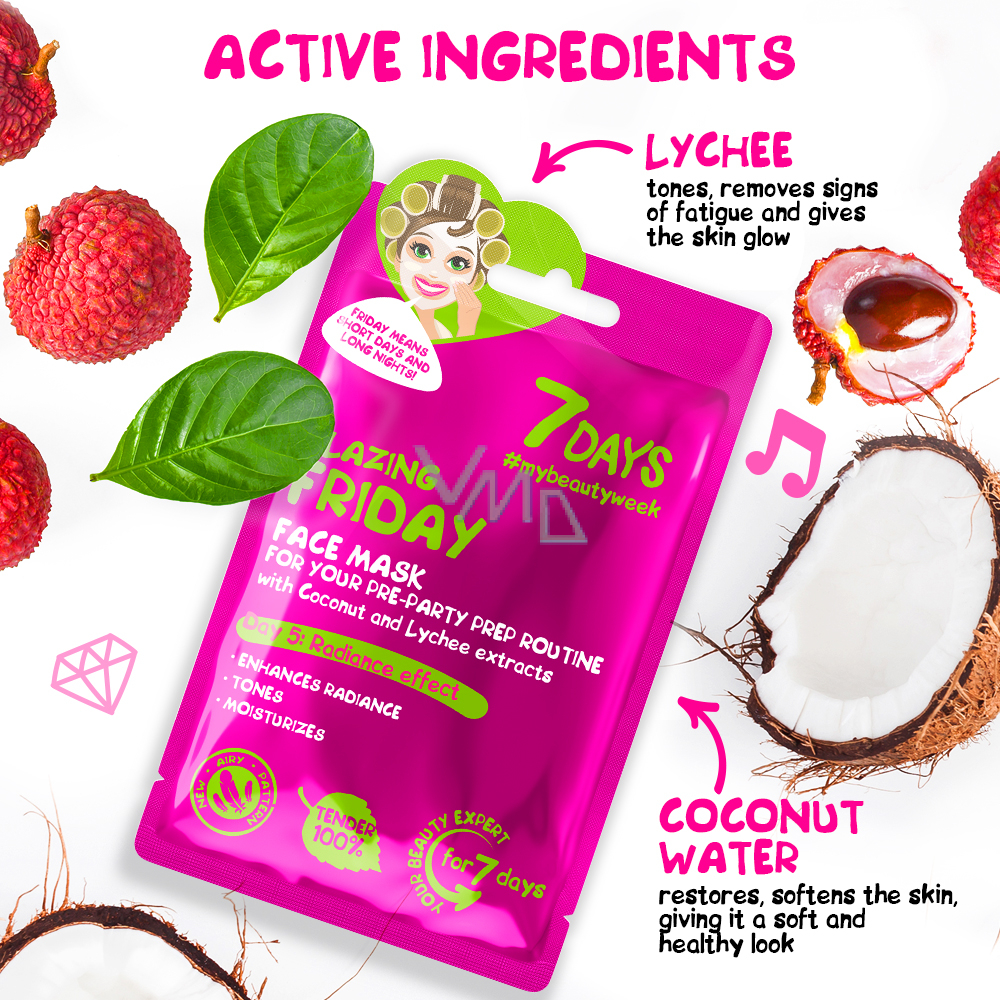 Pátek není jen krátký den, ale také dlouhá noc! Připravte se proto na večírek a nezapomeňte na masku BLAZING FRIDAY, která poskytuje expresní péči a v ničem plochém odstraní z vašeho obličeje všechny stopy náročného pracovního týdne. Kokosová voda má hloubkové regenerační účinky. Extrakt z liči dobíjí vaši pokožku vitální energií a zároveň tonizuje a odstraňuje známky únavy pro zdravý lesk. Jeho unikátní vitamínový komplex naplní vaši pokožku energií, vyrovná texturu a dodá jí odstín, který jste hledali. Kyselina hyaluronová poskytuje intenzivní hydrataci pro mladistvý, elastický odraz.
