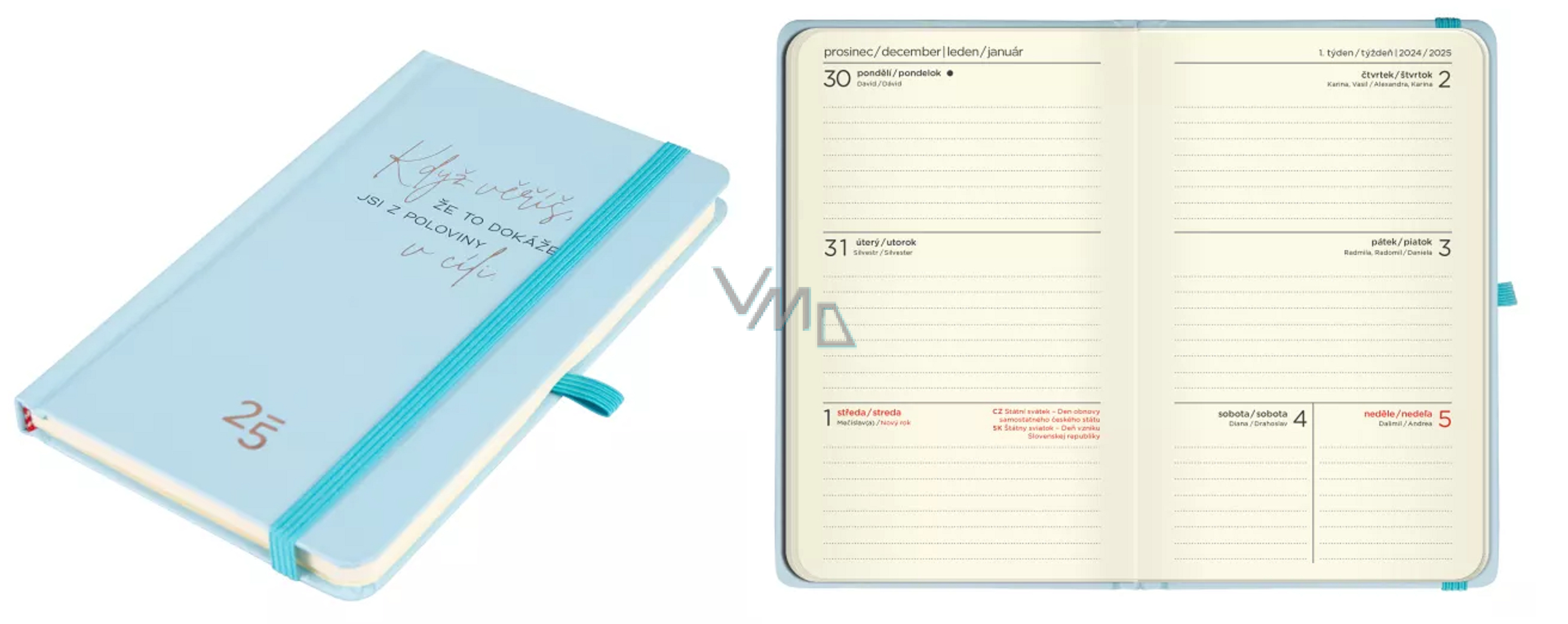 Oblíbená kapesní verze diářů je tu spolu s praktickým zavíráním na gumičku. Diářům na rok 2025 nechybí ani stuha jako záložka pro rychlou orientaci v diáři a poutko na propisku či tužku. V diáři najdete týdenní kalendárium na rok 2024 s dostatkem místa pro poznámky na každý den.