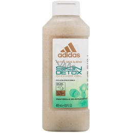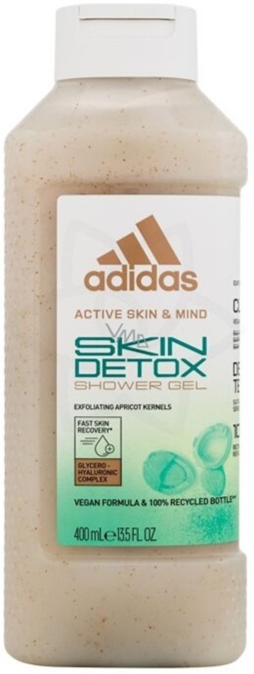 Sprchový gel Adidas Skin Detox s exfoliačním efektem obsahuje malé částečky z meruňkových pecek, které odstraní odumřelé buňky a zjemní, vyhladí pokožku. Pokožku zbaví toxinů a glycero-hyaluronový komplex se postará o hloubkovou hydrataci pokožky. Neobsahuje mýdlovou složku ani sulfáty. Lahev se dá plnit a je vyrobena ze 100% recyklovatelného plastu.