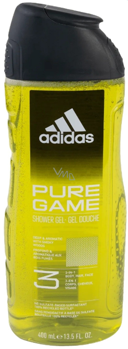 Všem mužům, kteří se potřebují zregenerovat se jistě bude hodit tento sprchový gel a šampón v jednom od značky Adidas. Pánský sprchový gel Adidas Men A3 Hair & Body Pure Game poznáte především díky zářivě zelené barvě a oslňující dřevité vůni. Ve sprchovém gelu jsou spojené jak ovocné, tak dřevité vůně. Adidas Men A3 Hair & Body Pure Game je ideální k nastartování do nového dne nebo k relaxaci těla i mysli po náročném dni.