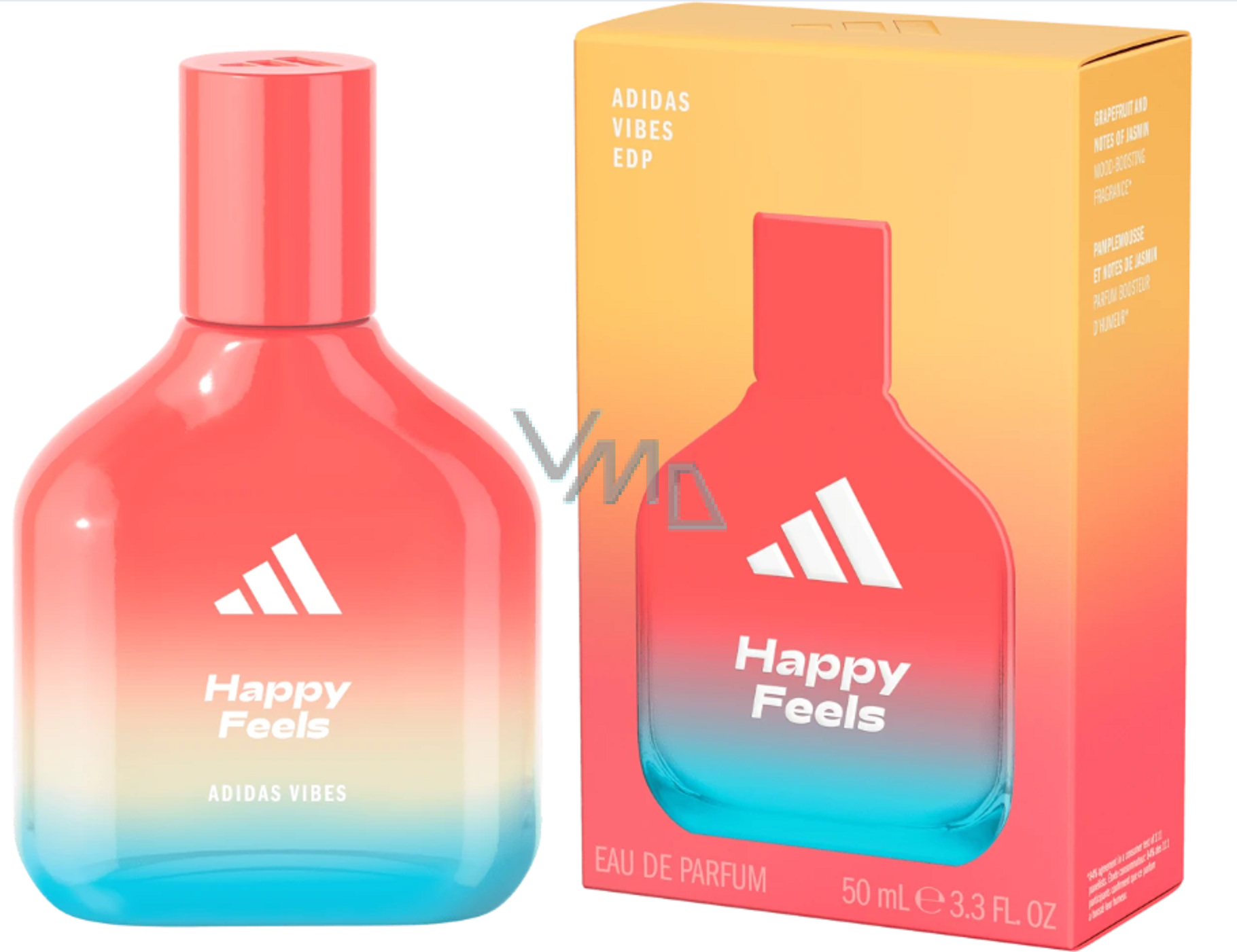 Pafémovaná voda Adidas Vibes Happy Feels má jiskřivé tóny grapefruitu a jasmínu a navozuje pocit pohody. Tato dlouhotrvající vůně s přírodními esenciálními oleji z citronu a pomeranče má veganské složení a je dermatologicky testovaná. Hodí se do každé situace. Nosem této vůně je Marypierre Julien.
