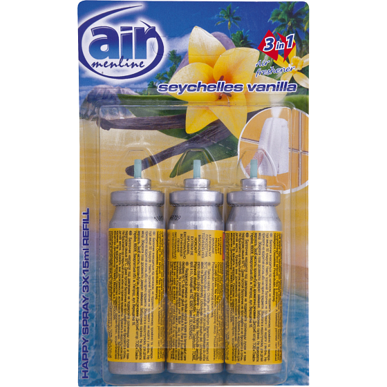Refill happy spray Seychelles Vanilla neutralisiert Gerüche und hinterlässt einen frischen Duft. Konzentriertes Aerosol Lufterfrischer. Ein einziger Druck reicht aus, um das Badezimmer oder die Toilette mit langanhaltendem frischen Duft zu erfüllen. Erfrischt die Luft schnell und effektiv. Neutralisiert unangenehme Gerüche und parfümiert den Raum angenehm. Enthält 3 Mini-Aerosole.
