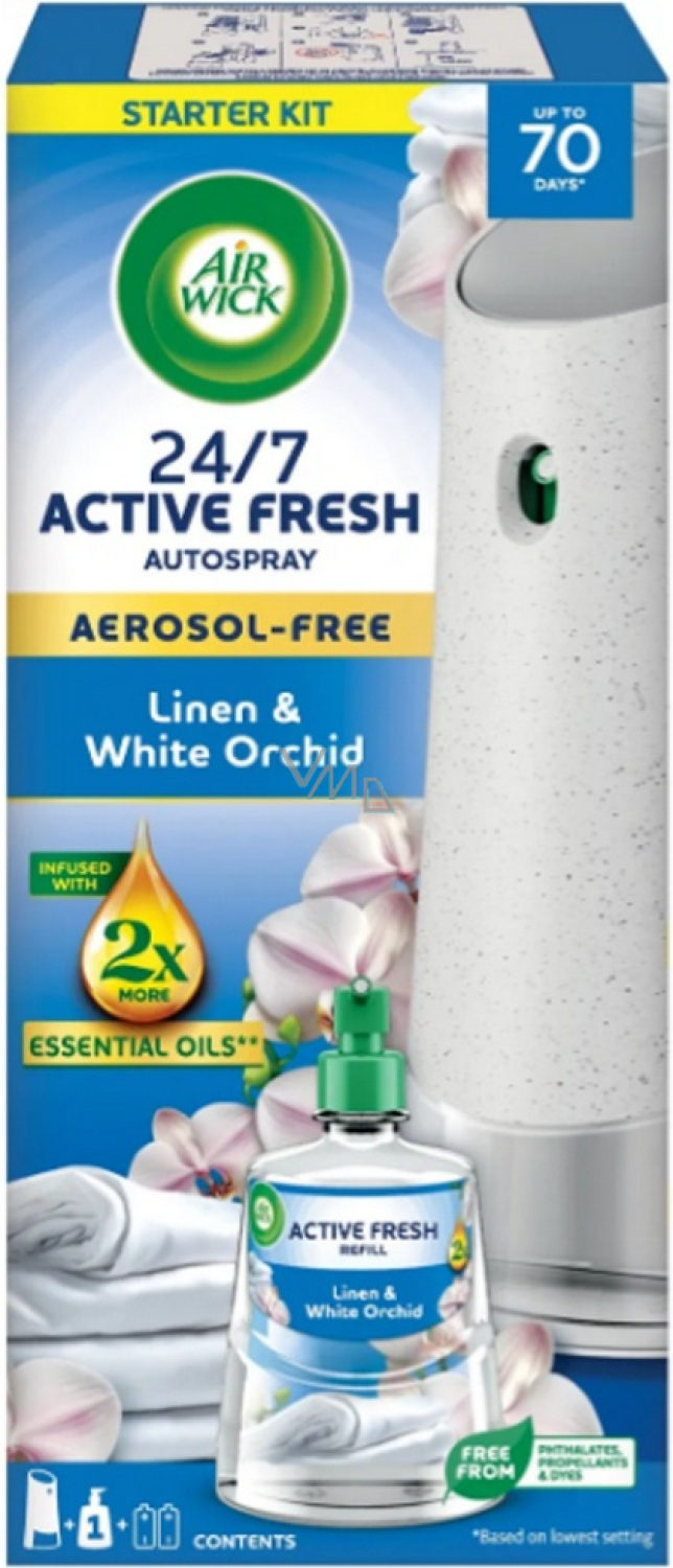 Air Wick Active Fresh Refill in der Variante Wäsche und weiße Orchidee ist ein automatischer Lufterfrischer, der in Ihr Zuhause den frischen Duft von sauberer Wäsche mit zarten blumigen Noten der weißen Orchidee bringt. Dieses Produkt ist darauf ausgelegt, unangenehme Gerüche zu neutralisieren und eine angenehme Atmosphäre über längere Zeit aufrechtzuerhalten.