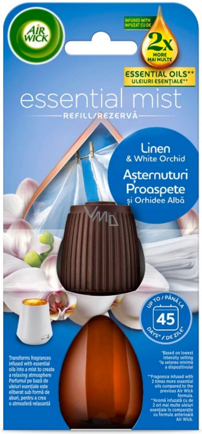 Air Wick Essential Mist Linen & White Orchid – Nachfüllung 20 ml bringt den zarten Duft frisch gewaschener Wäsche, bereichert mit eleganten Tönen der weißen Orchidee, in Ihr Zuhause. Dank der Technologie Essential Mist verbreitet sich der Duft natürlich in einem feinen Nebel, der den Raum langfristig und gleichmäßig parfümiert. Ideal für eine frische, reine und beruhigende Atmosphäre den ganzen Tag.