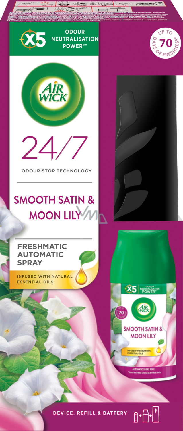 Air Wick FreshMatic automatický sprej ve formě difuzéru a náhradní náplň. Automaticky uvolňuje dávky vůně a zachovává stálou hladinu svěžesti ve vaší domácnosti. Zažijte lákavé květinové tóny Měsíční lilie a vklouzněte do luxusního světa saténových prostěradel a jemných parfémů.