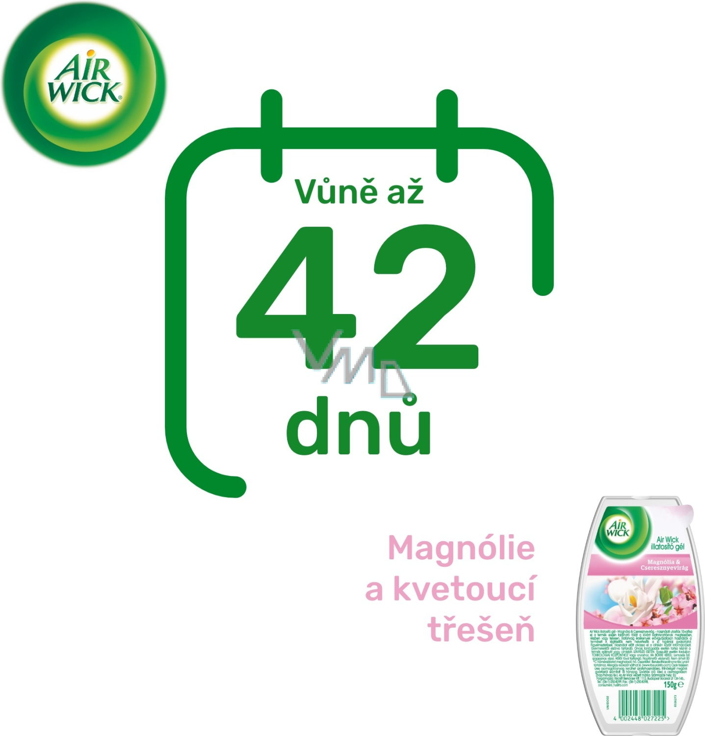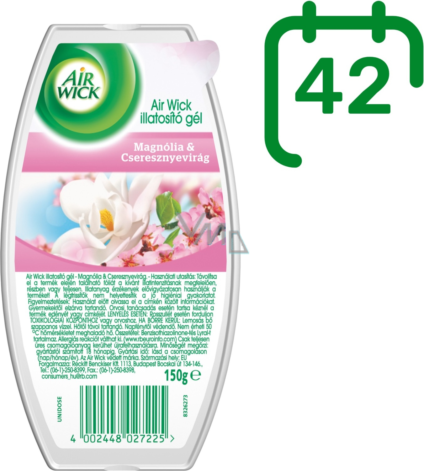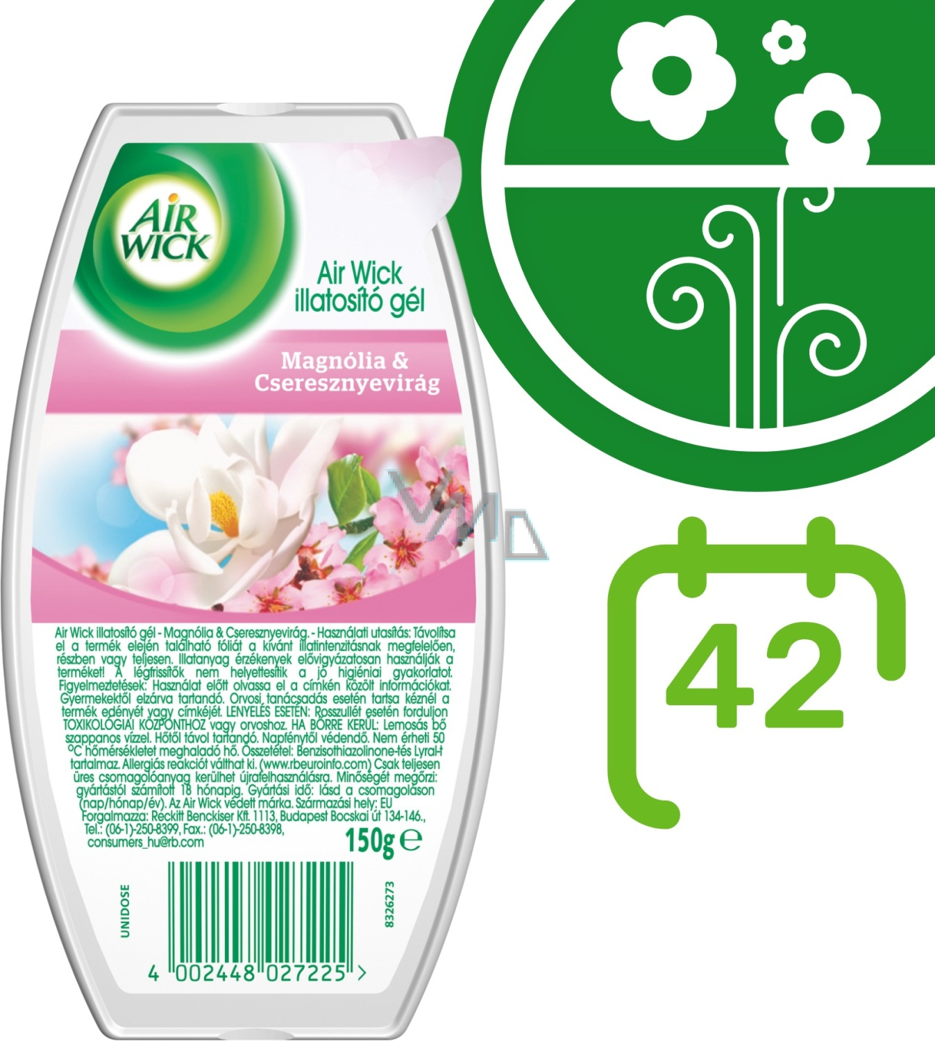 Air Wick Gel Magnolie und blühende Kirsche. Entfernen Sie die Folie von der Vorderseite des Produkts vollständig oder teilweise, um eine schrittweise Freisetzung des Duftes zu gewährleisten.
