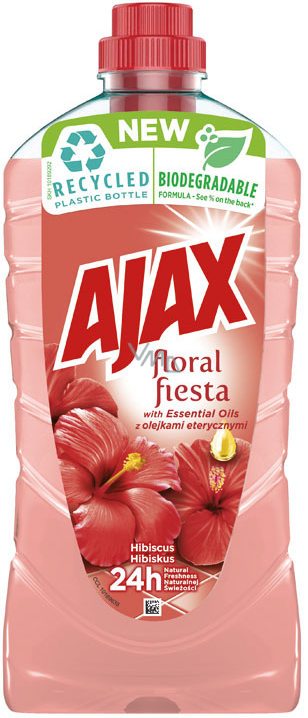 Objevte Ajax Floral Fiesta Ibišek s esenciálními oleji pro zářivě čisté povrchy a příjemně svěží domov až na 24 hodin po úklidu. Vůně ibišku. Čistící prostředek pro veškeré plochy v domácnosti. Dokonalá čistota, zářivý lesk, bez oplachování.