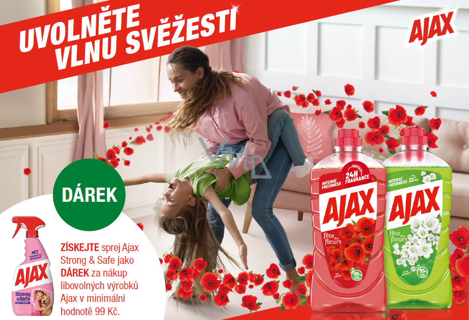 Kupte jakékoliv výrobky značky Ajax v minimální hodnotě 99 Kč a dostanete cestovní univerzální čistič Ajax Strong & Save v rozprašovači ZDARMA!