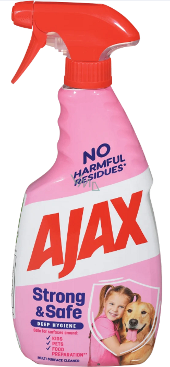 Univerzální čistič Ajax Strong & Safe poskytuje spolehlivou čisticí sílu bez škodlivých stop a je bezpečný pro použití na povrchy, které jsou v kontaktu s dětmi, domácími zvířaty a při přípravě jídel. Jeho složení obsahuje 99 % ingrediencí přírodního původu a může se pochlubit nádhernou vůní zázvoru a yuzu. Čistič není nutné oplachovat.