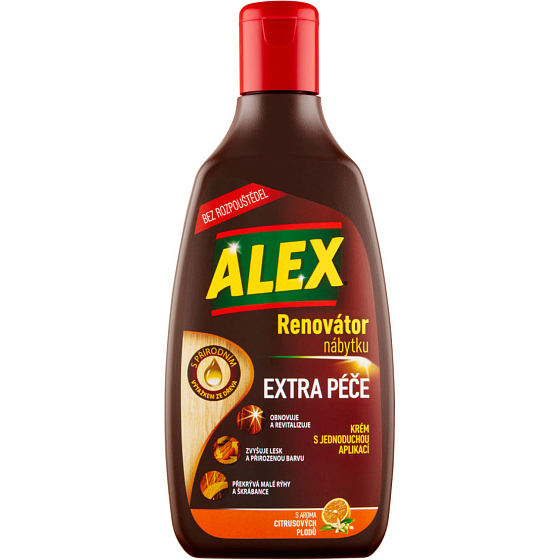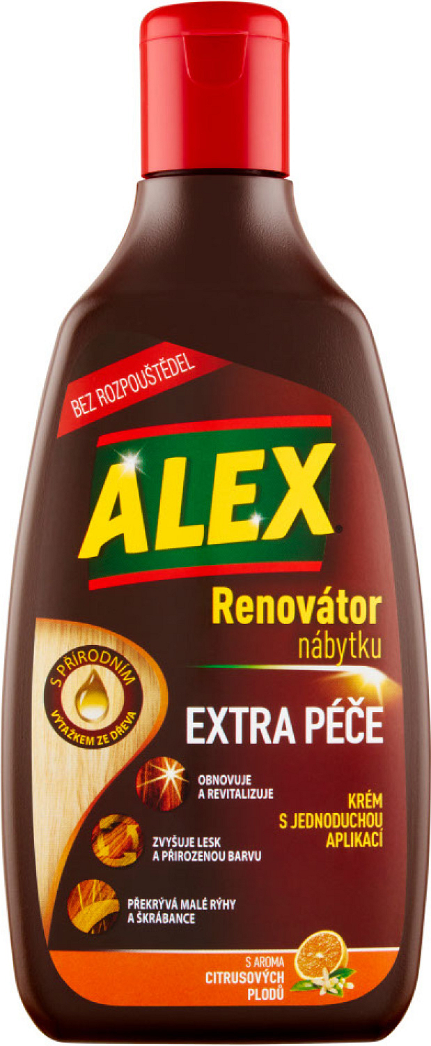 Alex Creme mit natürlichem Holzextrakt sorgt für maximale Pflege zur Renovierung und zum Schutz von Möbeln, sodass sie wie neu aussehen. Alex Extra Pflege ist die beste Lösung zur Wiederherstellung von Möbeln, selbst von den empfindlichsten. Seine exklusive Formel ermöglicht es, Möbel zu renovieren und zu revitalisieren, den Glanz zu erhöhen und die natürliche Farbe wiederzubeleben. Darüber hinaus verdeckt es kleine Kratzer und Schrammen. Es ist lösungsmittelfrei – schonend zur Oberfläche.