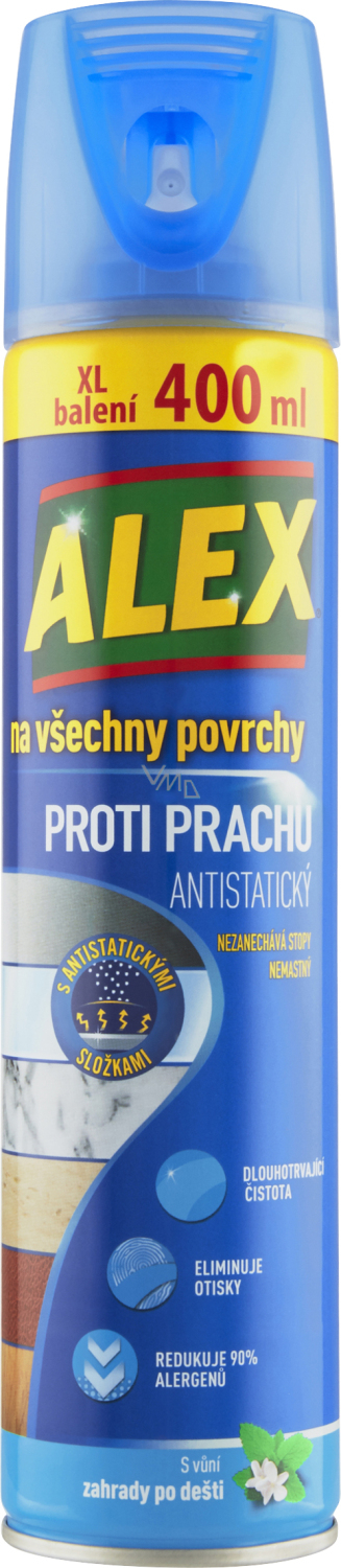 Das neue ALEX für alle Oberflächen mit antistatischen Komponenten ermöglicht es, alle Flächen länger sauber zu halten und verhindert so eine schnelle Wiederablagerung. Es reduziert 90 % der Pollenallergene* und Milben. Dank seiner exklusiven Zusammensetzung reinigt es alle Arten von Oberflächen: neue und alte Möbel, lackierte Möbel, Möbel aus Holzimitation, Holz, Laminat, Leder, Marmor, Granit, Edelstahl und Glas.