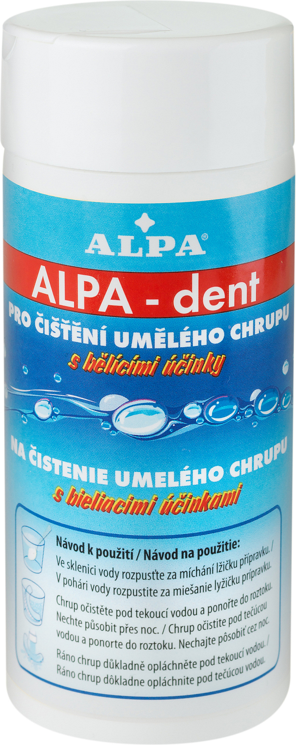 Alpa Dent enthält enzymatische Zusätze, die die Entfernung von Essensresten gewährleisten. Eine weitere Komponente ist eine Substanz mit bleichenden Eigenschaften für das gute Aussehen von Zahnersatz.
