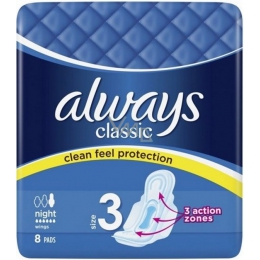 S hygienickými vložkami Always Classic Night můžete odpočívat v klidu. Hygienické vložky Always Classic Night jsou určeny na noc nebo při velmi silné Menstruaci, nabízejí vynikající ochranu (v porovnání s vložkami Always Classic Normal a Long).
