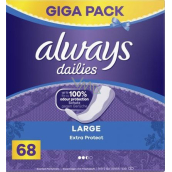 Intimky Dailies Extra Protect Large od Always vynikají svojí prodyšností a postranními ochrannými zónami, díky kterým poskytují perfektní ochranu před protečením. Technologie neutralizace zápachu zajistí maximální svěžest po celý den. Intimky poskytují spolehlivou ochranu a pohodlí a mají hebkou povrchovou vrstvu 2 v 1 pro ještě lepší absorpci. Always Dailies Extra Protect Large jsou dermatologicky testované. V porovnání s intimkami Fresh & Protect Normal jsou delší, čímž poskytují ještě větší ochranu.