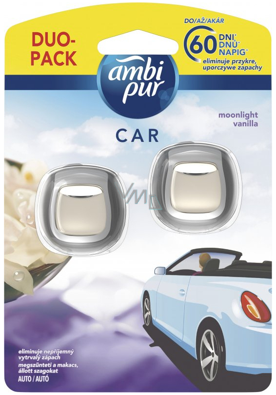 Chcete mít ve svém voze perfektně provoněný interiér? Díky stylové vůni do auta značky AMBI PUR budou vaše přání proměněny v realitu. Díky jednomu kusu provoníte interiér až na 30 dnů. Ambi Pur Car Moonlight Vanilla je decentní vůně vanilky. Tato vůně do auta provoní interiér díky umístění u ventilační mřížky. Aplikace vůně je snadná, je určena do výdechu klimatizace.