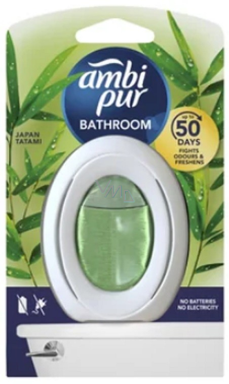 Ambi Pur Bathroom Japan Tatami přinese do vaší koupelny příjemnou svěží vůni. Osvěžovač odstraňuje ze vzduchu pachy a současně zabraňuje jejich usazování na měkkých površích, jako jsou ručníky, vany či sprchové závěsy. Díky jedinečné technologii Odour Clear zajistí nepřetržitou svěžest až po dobu 45 dní. Osvěžovač vzduchu je gelový, takže funguje bez nutnosti použití baterií či elektrické energie. Provoňte vaši koupelnu výjimečnou vůní pomocí Ambi Pur Bathroom.
