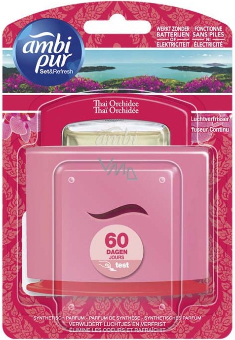 Osvěžovač vzduchu Ambi Pur Non Stop Fresh Thai Orchid eliminuje nepříjemný zápach a dodá svěží vůni orchidejí. Ideální do malých až středně velkých místností. Nonstop svěžest, až 60 dnů nepřetržité svěží vůně. Používejte pouze s vonnými náplněmi Ambi Pur Non Stop Fresh pro neustálou svěžest.