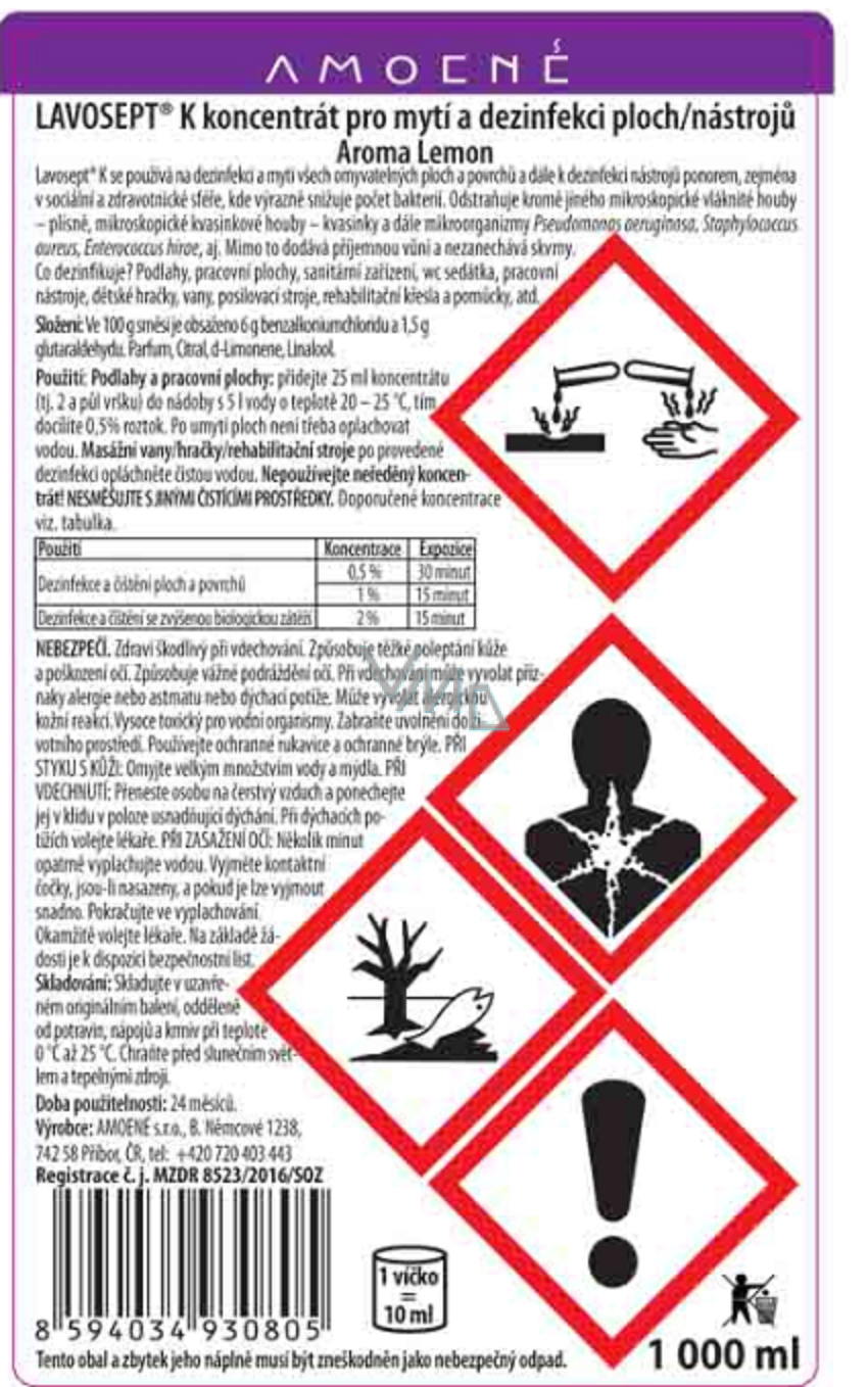 LAVOSEPT® K je dezinfekční přípravek na bázi kvartérních amoniových solí a aldehydů ve formě koncentrátu (proto je třeba jej před použitím rozředit) pro dezinfekci ploch, roušek a nástrojů.