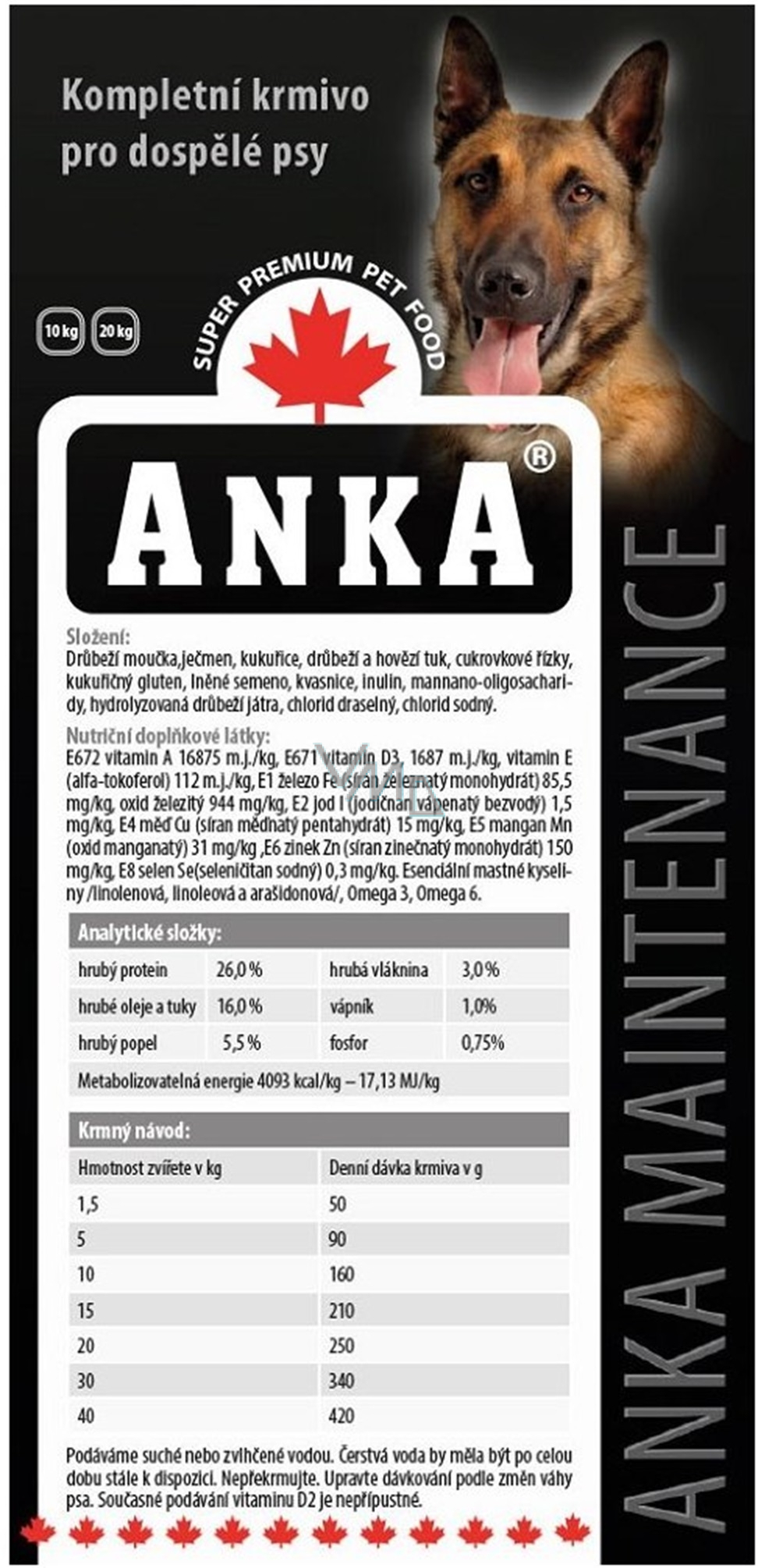 Anka Maintenance je špičková strava pro dospělé psy. Vysoký obsah všech důležitých složek přináší kompletní výživu. Anka Maintenance obsahuje nejkvalitnější drůbeží maso, tuk, obilniny, přírodní vitaminy a minerály - proto mnozí profesionální i amatérští chovatelé, trenéři a majitelé psích útulků dávají přednost tomuto výrobku.