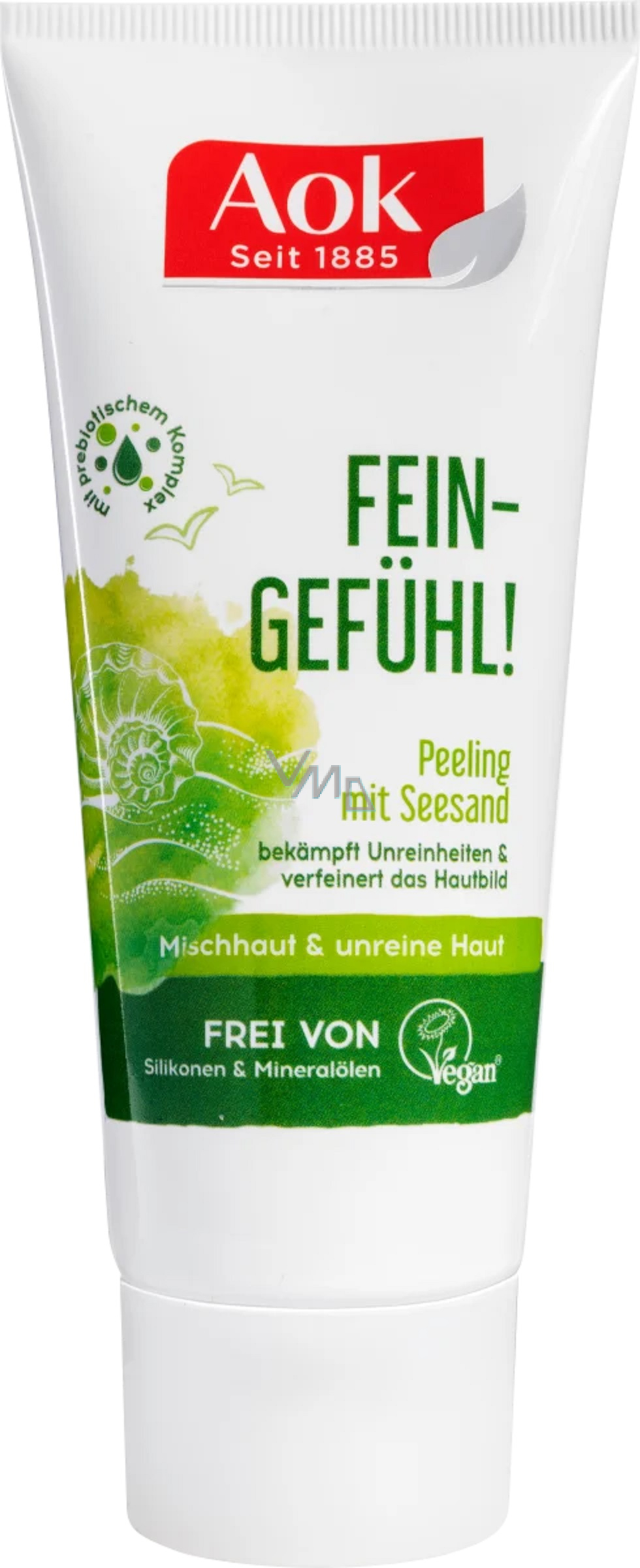 Peeling Aok Fine Feeling! s bílým čajem a jemným mořským pískem snadno odlupuje odumřelé kožní buňky a odstraňuje nečistoty. Je ideální pro smíšenou a problematickou mastnou pleť. Bílý čaj pomáhá pokožku zbavovat škodlivých látek. Výborně hojí hnisavá ložiska a regeneruje pokožku.