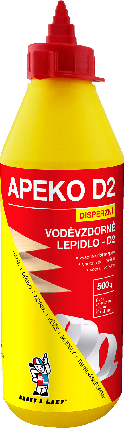 APEKO D2 ist ein universeller wasserverdünnbarer Holzkleber mit verlängerter Fixierzeit, schneller Trocknung, der hochfeste elastische Verbindungen bildet. Er ist zum Verkleben von weichem und hartem Holz bestimmt, insbesondere von Holzfurnieren, Sperrholz, Spanplatten, Papier, Karton, Leimholz, Tischler- und Montageschnitten. Außerdem findet er Anwendung im Modellbau oder in der Verpackungstechnik für flächige Presskleber und im Innenbereich für wasserfeste Verklebungen gemäß der Widerstandsklasse D2. Flächen und Verbindungen, die mit APEKO D2 geklebt werden, schädigen die Schneidwerkzeuge von Maschinen, die in der Holzverarbeitungs- oder Möbelindustrie verwendet werden.