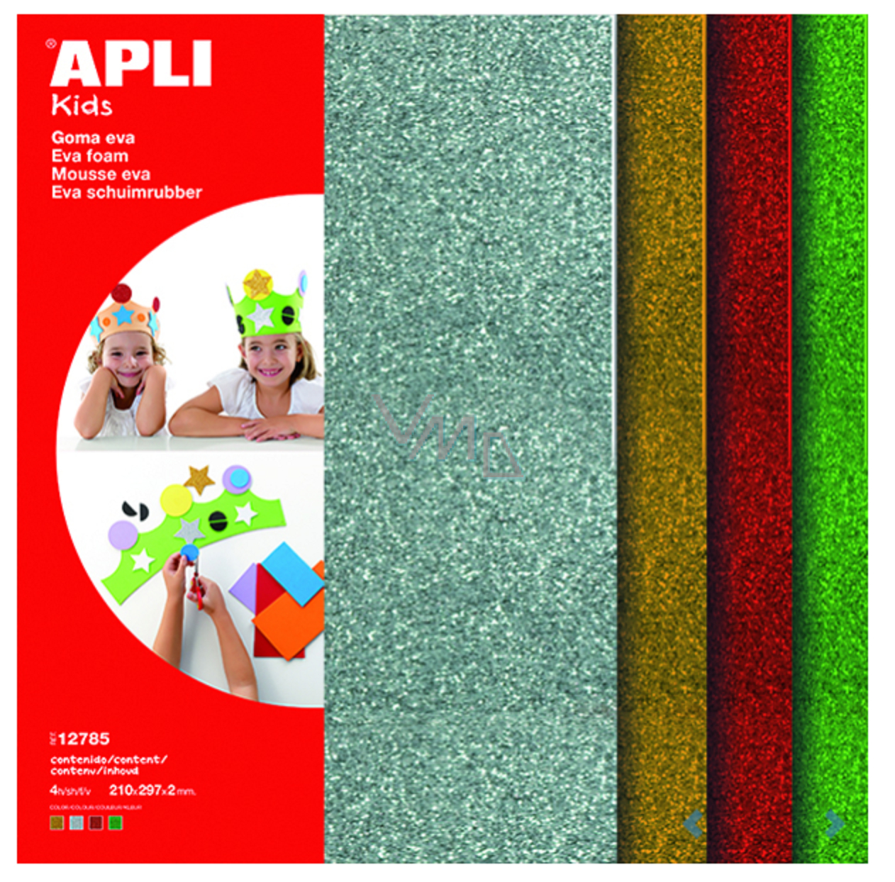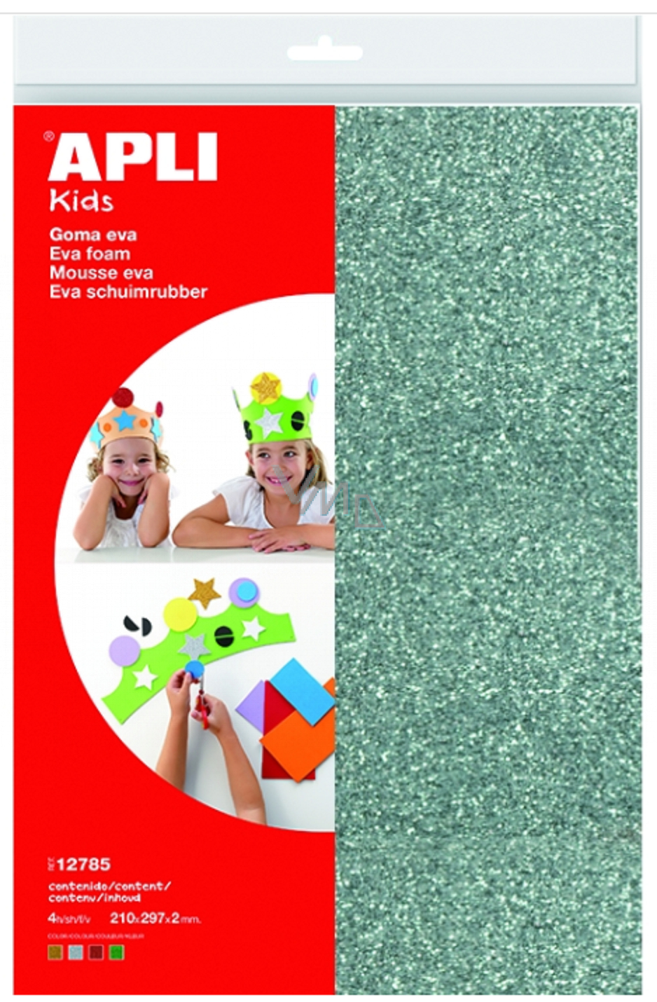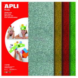 Pěnovka s povrchem pokrytým metalickými třpytkami ve 4 barvách. Ideální materiál pro tvorbu dekorací, výtvarné a pedagogické aktivity. Pěnovku lze stříhat, lepit nebo z ní vysekávat drobné tvary děrovačkami. Díky své pevné struktuře je pěnovka APLI vhodná k tvarování. Je měkká, bez ostrých hran a odolná (vhodná i pro dekorace v exteriéru). Zdravotně nezávadná, vhodná pro děti od 3 let. Rozměr listu: 210 x 297 x 2 mm. Balení: 4 ks/ 4 barvy.