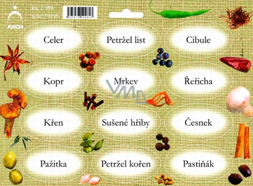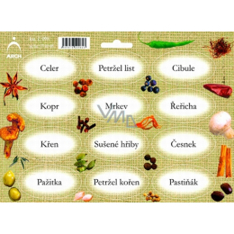 Úplný soubor všech dostupných druhů koření, přehledně členěný do 12 různých aršíků. Na každém aršíku je 12 předseknutých štítků. Štítky jsou po vyloupnutí okamžitě k použití.