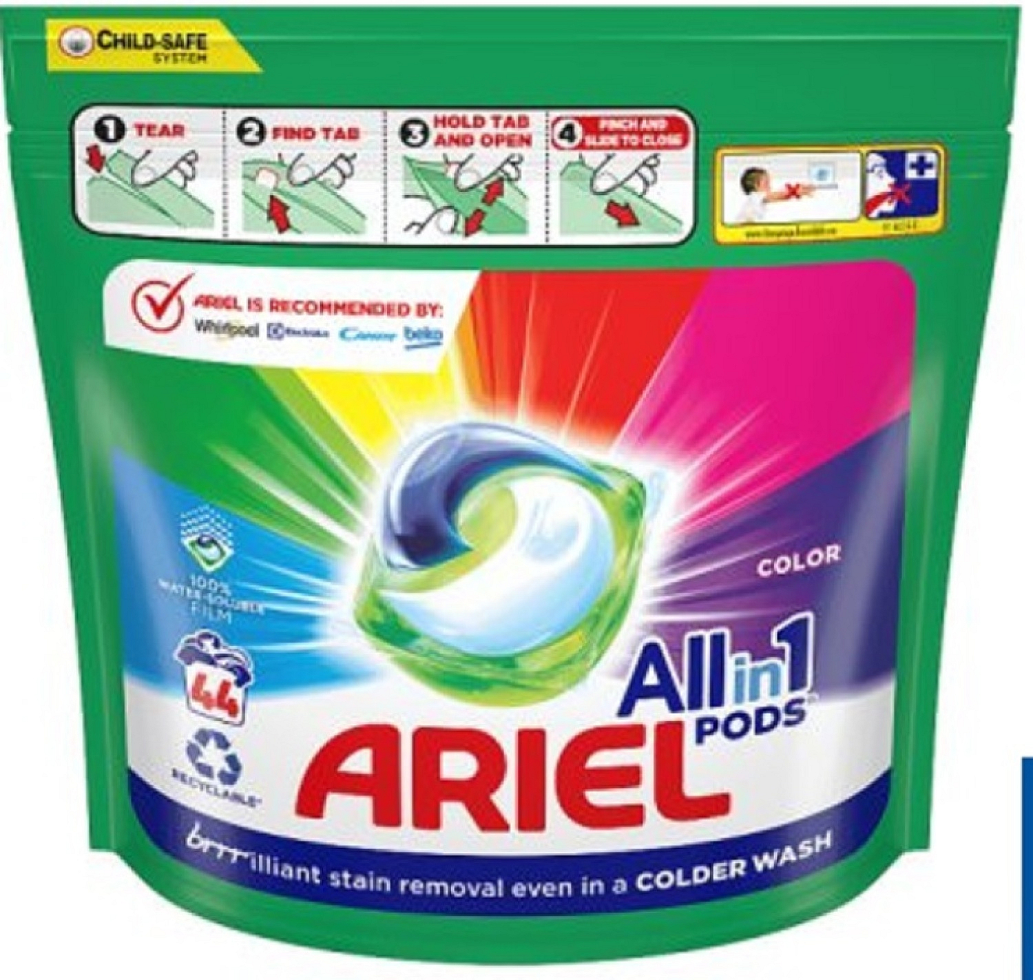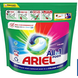 Ariel Allin1 Color sind effektive Waschmittelkapseln, die speziell für bunte Wäsche entwickelt wurden. Dank der innovativen mehrschichtigen Technologie entfernen die Kapseln Flecken, schützen die Farben vor dem Verblassen, hinterlassen die Wäsche frisch und sauber und helfen, die Fasern in gutem Zustand zu halten.