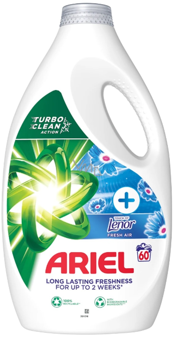 Ariel prací gel +Touch Of Lenor Fresh Air pomáhá odstranit skvrny již od prvního praní, a to i při nižších teplotách a kratším cyklu. Jeho složení bylo speciálně navrženo pro rychlé praní s účinkem Turbo Clean. Obsahuje 80 % organických složek, které jsou biologicky rozložitelné, a dodává se ve 100% recyklovatelném obalu. Dopřejte svému prádlu hygienickou čistotu, péči o vlákna a dlouhotrvající svěžest po dobu až 2 týdnů (při uložení ve skříni).