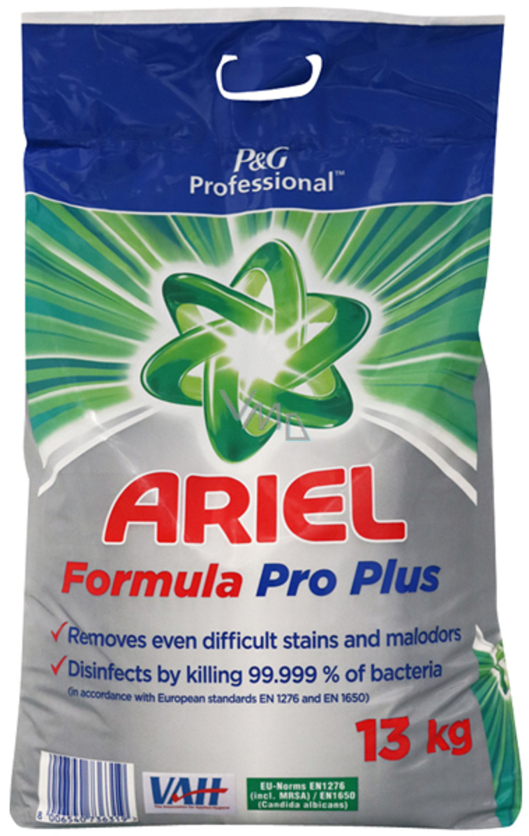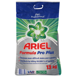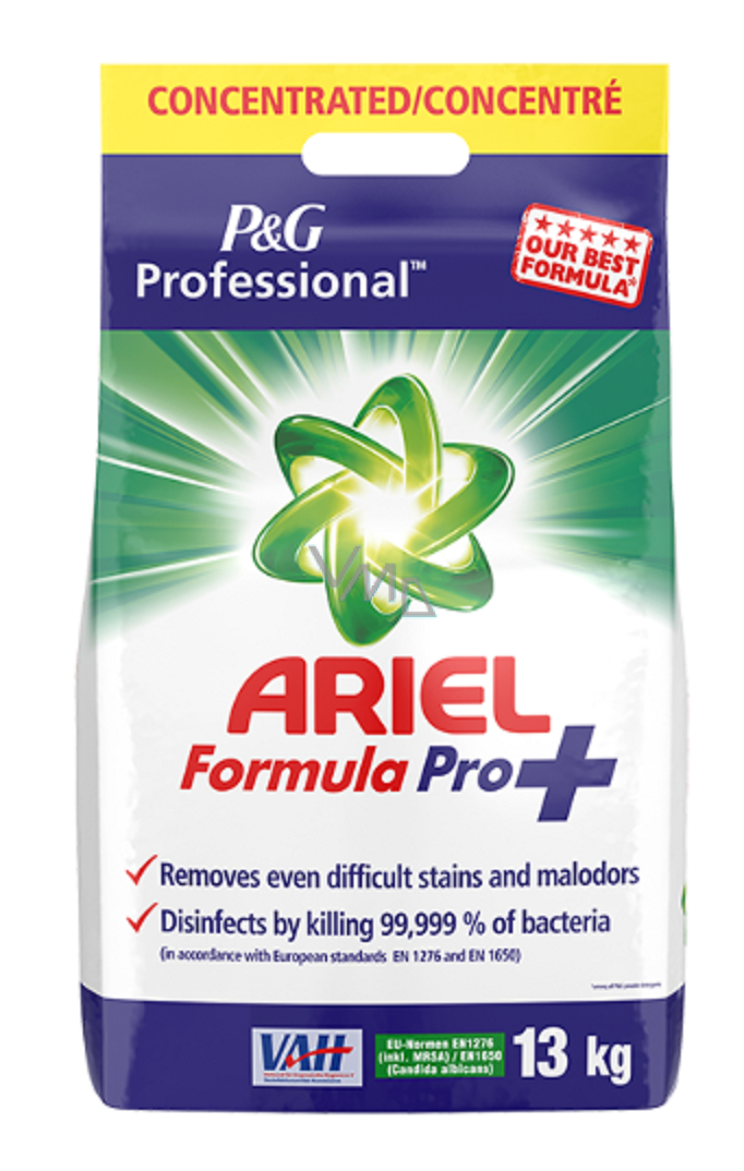 Dezinfekční prací prášek Ariel Formula Pro Plus nejen pro profesionální použití v oblasti zdravotní a sociální péče. Odstraňuje nejodolnější skvrny a zabíjí 99,999 % bakterií (dle EN1276 a EN13697, dodržujte návod k použití).