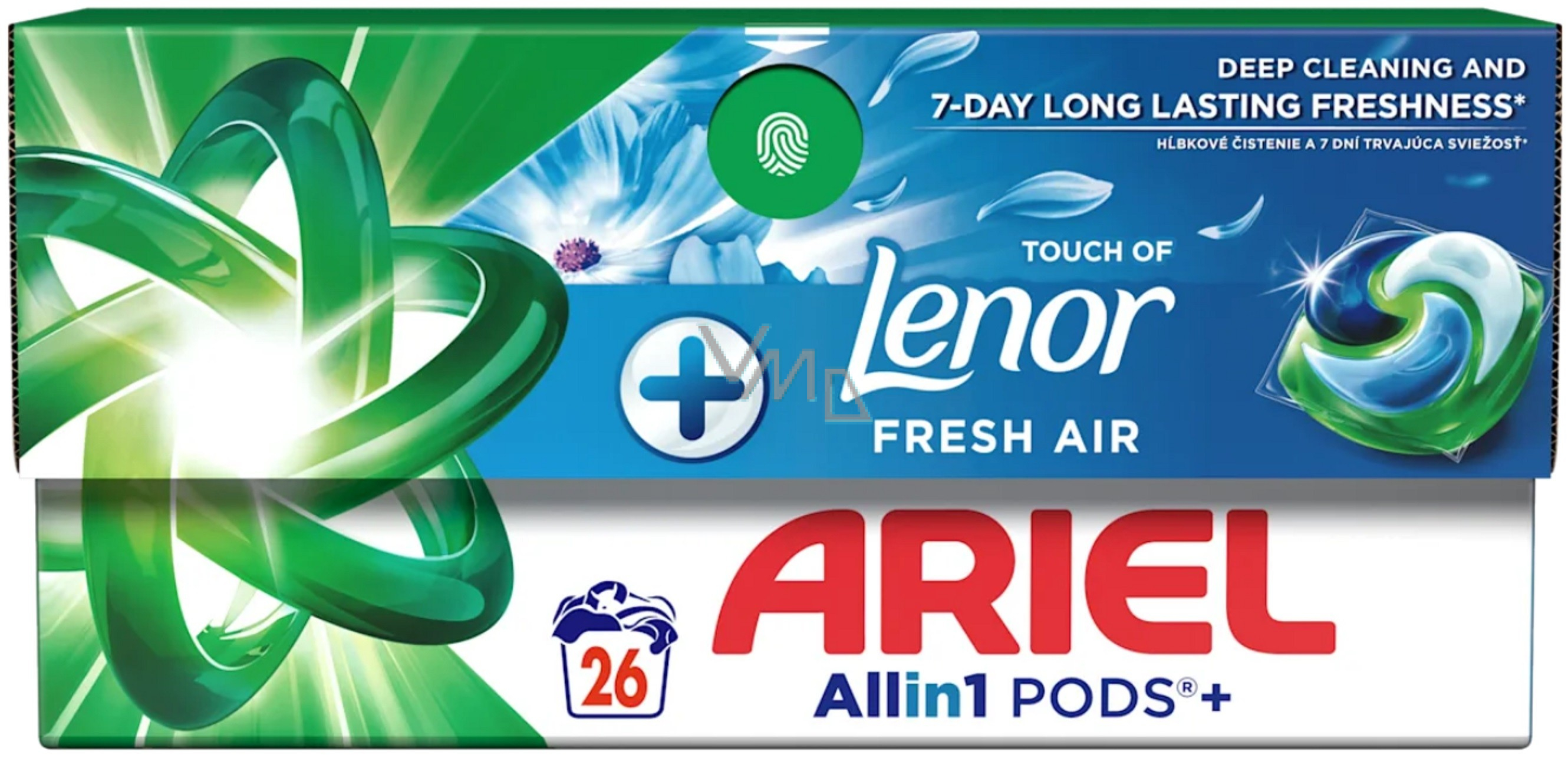 Hledáte univerzální řešení pro bezstarostné praní? Ariel All-in-1 +Lenor Fresh Air prací kapsle spojují sílu Arielu s dlouhotrvající svěžestí Lenoru. Díky modré komůrce zajistí 7 dní vůně vašemu prádlu – i po vyjmutí ze skříně.
