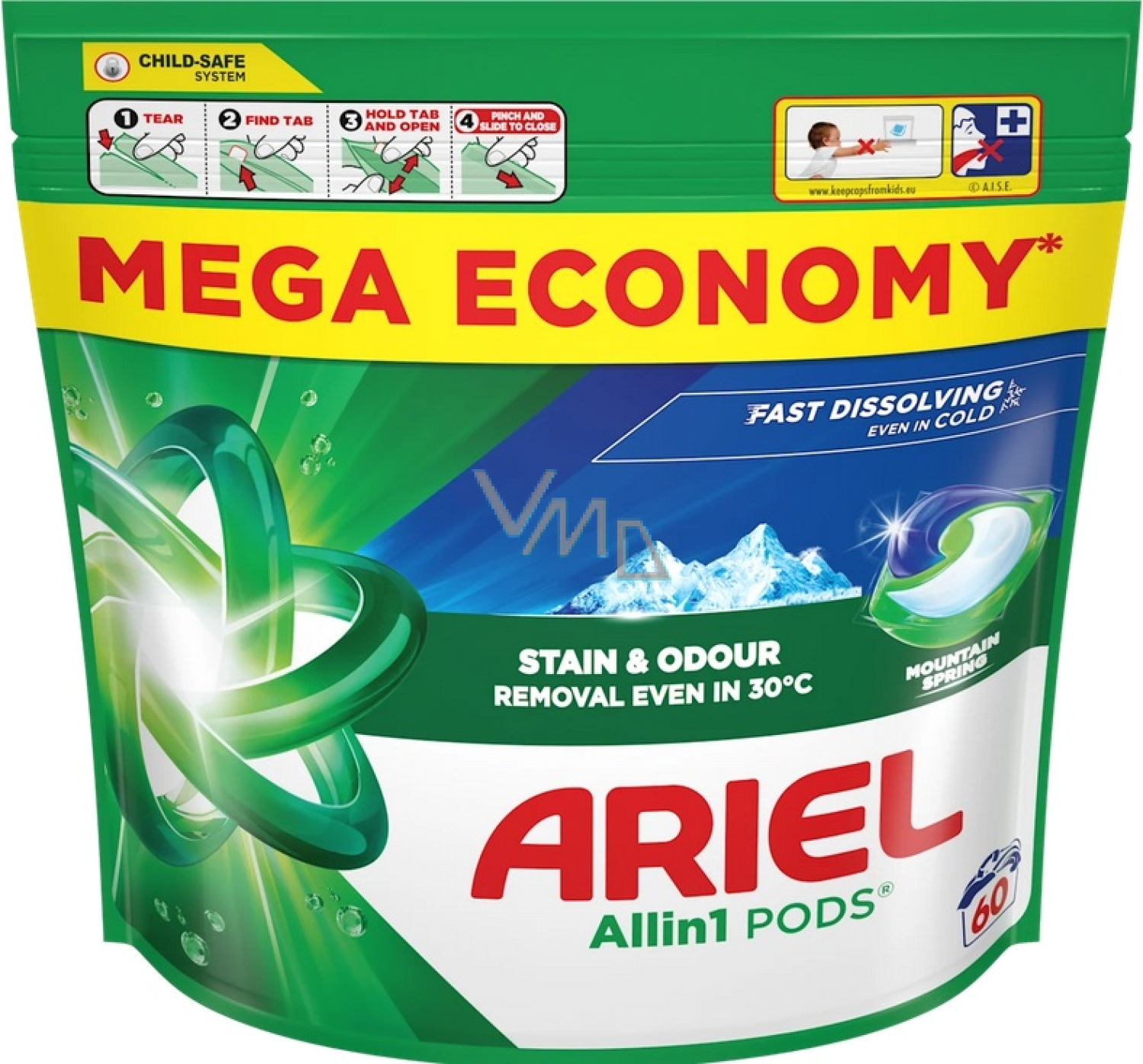 Ariel Mountain Spring sind praktische Waschmittelkapseln, die Flecken effektiv entfernen, die Farben aufhellen und die Wäsche frisch mit dem Duft eines Gebirgsquells hinterlassen.