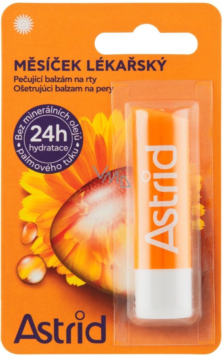 Astrid Měsíček lékařský pečující balzám na rty je obohacený měsíčkem lékařským, který je známý svými zjemňujícími a léčivými účinky na vysušené rty. Ricinový olej ve složení je bohatý na esenciální mastné kyseliny, minerály a vitamíny, a působí jako přirozený zvlhčovač, který rtům dodává hedvábnou texturu a hydrataci. Intenzivní péče a hydratace až 24 hodin.