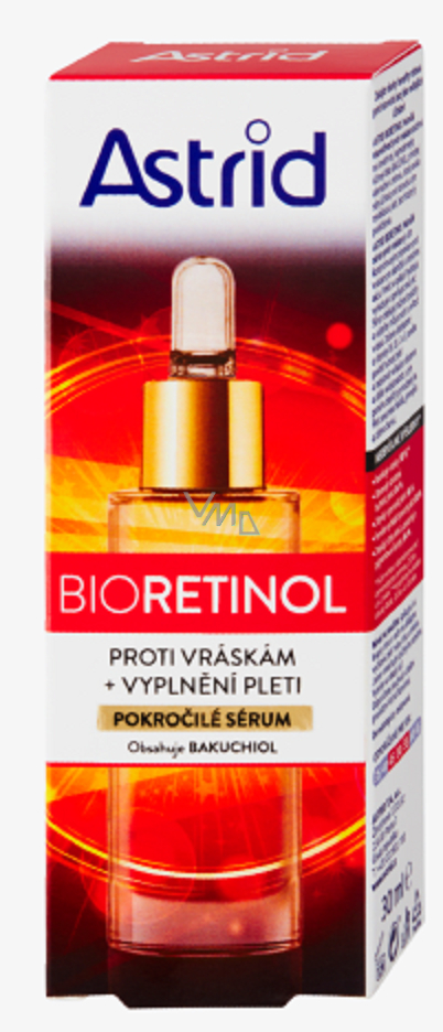 Astrid sérum proti vráskám Bioretinol je ultra koncentrovaným přípravkem proti vráskám pro okamžitou a intenzivní akci. Ihned po aplikaci hydratuje, vyhlazuje a zpevňuje zralou pleť. Sérum zlepšuje pružnost pokožky a viditelně snižuje počet a velikost vrásek. Složení obohacené o vitamíny B5, B3, C a E, pomáhá posílit hutnost pleti a redukovat nežádoucí zbarvení a další nedokonalosti, a tím pomáhá zlepšit její přirozený jas. Pleť zanechává hladší, jemnější a zdravě zářivou.