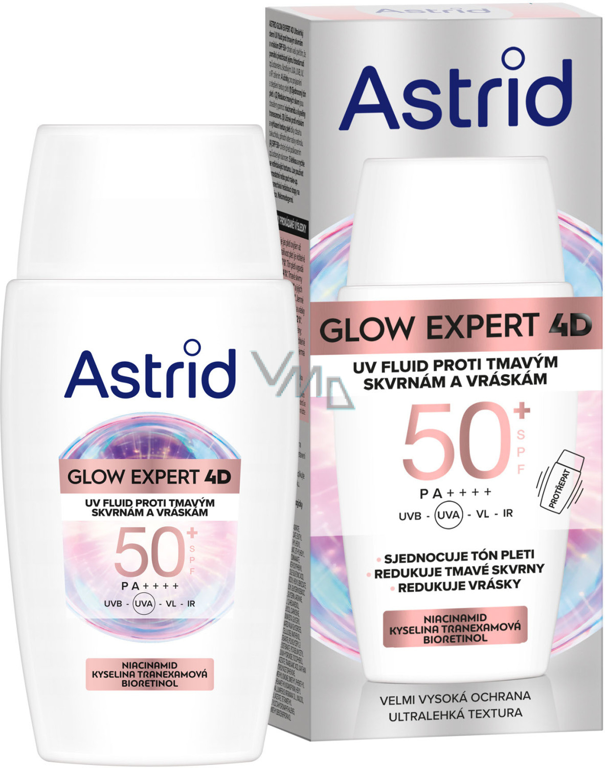 Astrid Glow Expert 4D Gesichtsonnenfluid OF50+ ist konzipiert gegen dunkle Flecken und Falten. Das Fluid schützt Ihre Haut, indem es hilft, deren lichtbedingter Alterung durch schädliche UVA-, UVB-, VL¹- und IR¹-Strahlen vorzubeugen. Das ultraleichte Fluid hat 4 Wirkungen zur Aufhellung und Verbesserung der Hautstruktur. Ein einheitlicher Hautton und die Reduzierung dunkler Flecken werden durch Niacinamid und tranexamische Säure erreicht. Die Wirkung gegen Falten und die Glättung der Hautstruktur dank des Inhalts von Bakuchiol, einer natürlichen Alternative zu Retinol. SPF 50+ schützt vor Sonnenschäden. Außerdem hat es eine leichte und schnell einziehende Textur und kann allein oder unter Makeup verwendet werden. Das Fluid hinterlässt keine unerwünschten Rückstände auf der Haut und ist nicht komedogen.
