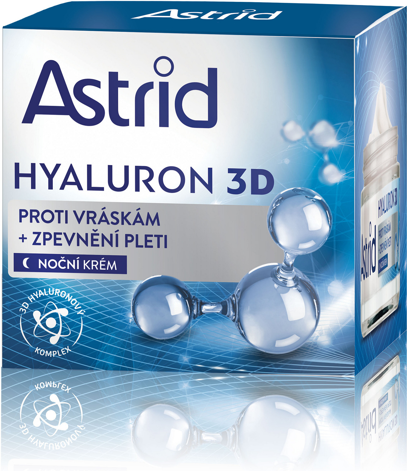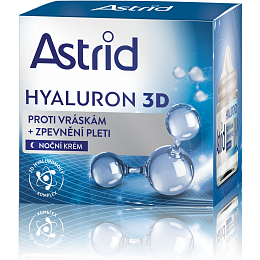 Zpevňující noční krém Astrid Hyaluron 3D pomáhá redukovat vrásky, zlepšuje pevnost a pružnost pleti. Pomáhá redukovat hloubku a délku vrásek - po aplikaci vyhlazuje vrchní vrstvu pokožky a ve spodních vrstvách pak napomáhá zlepšit její elasticitu a pevnost. Navíc přispívá k optimální hydrataci pokožky a zanechává jí sametově jemnou a pružnou. Krém poskytuje pleti omlazující péči během spánku.