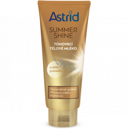 Chcete vypadat opáleně, ale dovolená ani relax na zahradě vás zrovna nečeká? Vše vyřeší tónovací tělové mléko pro světlou pokožku Astrid Summer Shine. Obsahuje jemné tónovací složky a vaší pokožce tak dodá stejnoměrné a přirozeně vypadající opálení už za velmi krátkou dobu. Tónovací mléko Astrid obsahuje kakaové a bambucké máslo bohaté na vitaminy A, C, E a minerály. Vaše pokožka díky tomu bude hydratovaná, chráněná před vysušením, vyživená a hedvábně jemná. Přirozené opálení pomáhá zajistit olej z vlašských ořechů. Mléko se snadno aplikuje i vstřebává.
