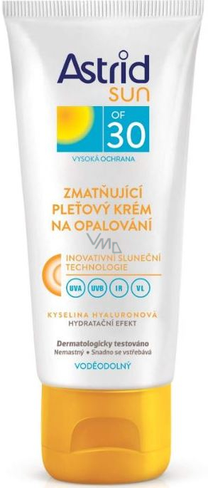 Astrid Sun Zmatňující pleťový krém na opalování OF 30 s inovativní sluneční technologií (UVA/UVB/IR*/VL*) poskytuje pokožce širokospektrální fotostabilní ochranu před škodlivými vlivy UV a infračerveného záření a viditelného světla. Složení obohacené o kyselinu hyaluronovou poskytuje efektivní hydrataci, chrání pleť před ztrátou vlhkosti během slunění a zmatňuje ji. Snadno se vstřebává a nezanechává pocit mastnoty.