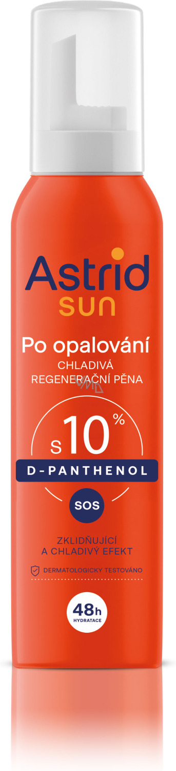ASTRID SUN Kühle Regenerationsschaum nach dem Sonnenbaden mit hohem Gehaltd an D-Panthenol (10%) hilft, reizbare Haut zu beruhigen , insbesondere nach dem Sonnenbaden. Bietet ein Gefühl der kühlenden Erfrischung, hydratisiert die Haut bis zu 48 Stunden und trägt zur Linderung von Brennen und Rötungen bei. Das enthaltene D-Panthenol hat ausgeprägte beruhigende Wirkungen, unterstützt die Regeneration und Hydratation der Haut, erhält deren Elastizität und Weichheit.