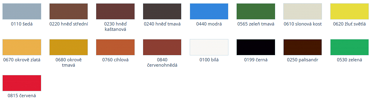 Es wird in matter oder glänzender Farbe in Tönen gemäß speziellen Farbmusterkarten hergestellt, oder es wird als Basis in die gewünschten Töne im Tönungssystem TELURMIX in unseren Unternehmensverkaufsstellen BARVY A LAKY DROGERIE eingefärbt.