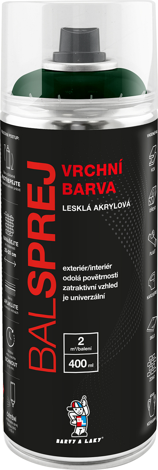 BALSPREJ je univerzální lesklá vrchní barva ve spreji verwendbar für Anstriche von Holz, Metall, Karosserien und einigen Kunststoffen. Es zeichnet sich durch eine hohe Ergiebigkeit aus, ist schnell trocknend und läuft nach der Sprühung nicht ab. Es ist beständig gegen Witterungseinflüsse und Korrosion. Es kann mit klarem Acryllack in Sprayform überstrichen werden.