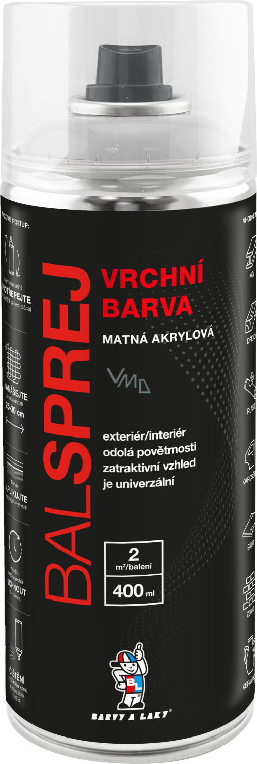 BALSPREJ ist eine universelle Oberflächenfarbe in Sprayform verwendbar für Anstriche von Holz, Metall, Karosserien und bestimmten Kunststoffen. Es zeichnet sich durch hohe Ergiebigkeit aus, ist schnelltrocknend und läuft nach dem Sprühen nicht ab. Es ist beständig gegen Witterungseinflüsse und Korrosion. Es kann mit transparentem Acryllack in Sprayform übergesprüht werden.