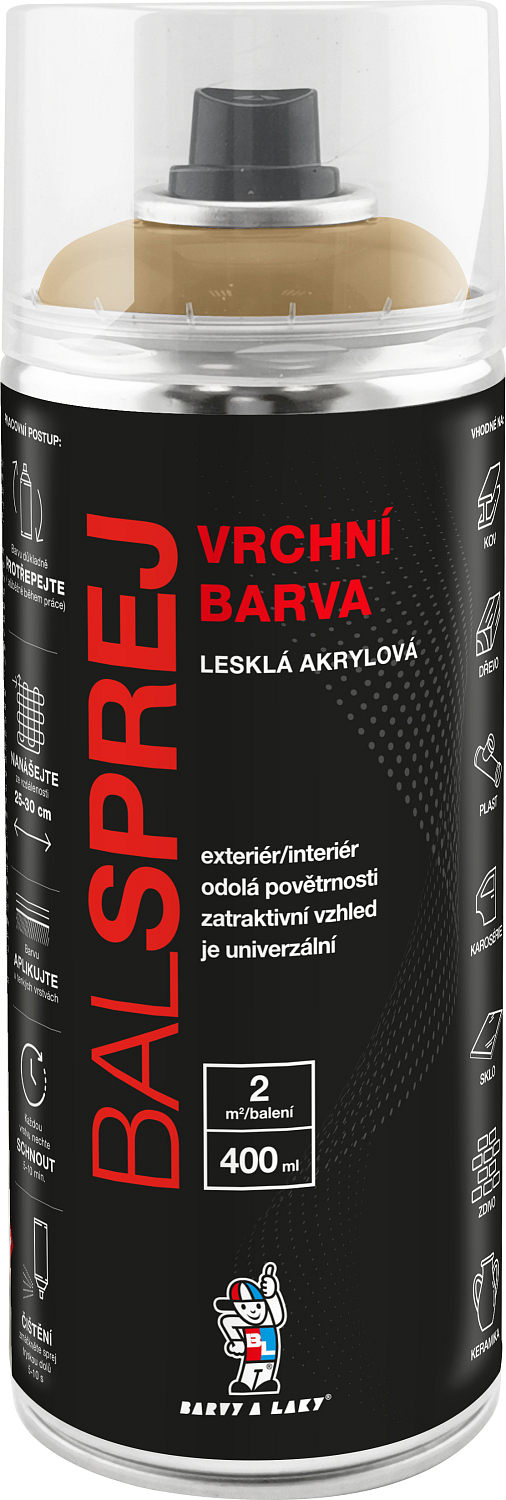 BALSPREJ je universelle glänzende Deckfarbe in Sprayform eine verwendbare Farbe für Holz, Metall, Karosserien und einige Kunststoffe. Sie zeichnet sich durch ihre Ergiebigkeit aus, ist schnelltrocknend und läuft nach dem Sprühen nicht herunter. Sie ist beständig gegen Witterungseinflüsse und Korrosion. Sie kann mit einem farblosen Acryllack in Sprayform übergesprüht werden.