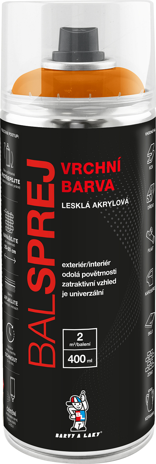 BALSPREJ ist eine universelle glänzende Oberflächenfarbe in Sprayform verwendbar für Beschichtungen von Holz, Metall, Karosserien, einigen Kunststoffen. Sie zeichnet sich durch hohe Ergiebigkeit aus, ist schnelltrocknend und läuft nach dem Sprühen nicht ab. Sie ist wetterbeständig und korrosionsbeständig. Sie kann mit klarem Acrylspray lackiert werden.