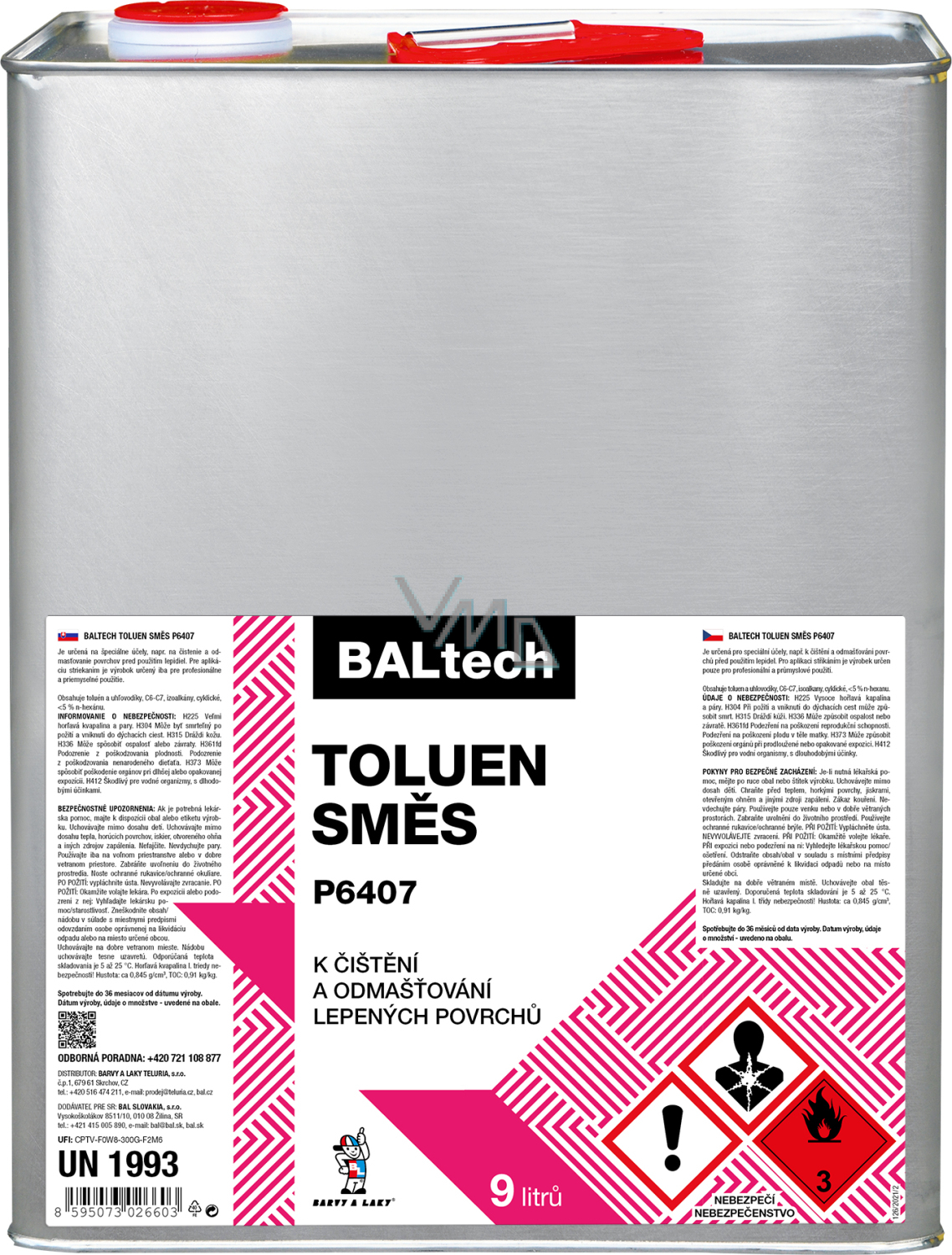 BALTECH P6407 TOLUOL-MISCHUNG ist für spezielle Anwendungen bestimmt, z. B. zur Reinigung und Entfettung von Oberflächen vor der Verwendung von Klebstoffen. Das Produkt ist nur für den professionellen und industriellen Einsatz zum Sprühen bestimmt.