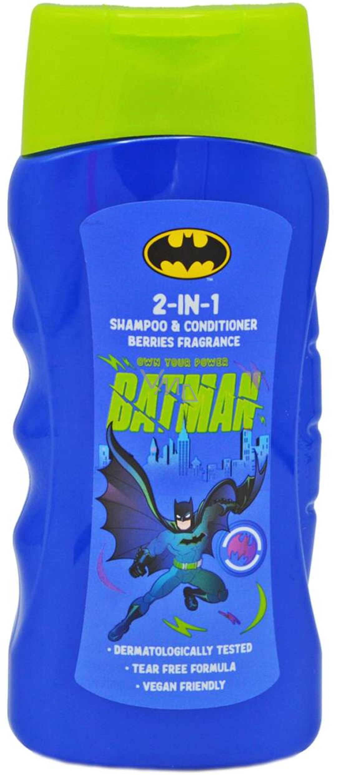 Tato pohodlná kombinace šamponu a kondicionéru 2v1 Batman je nejen účinná, ale má také nádhernou vůni bobulí. Díky němu je koupel zábavná a zároveň udržuje vlasy čisté a jemné, to vše s nádechem superhrdinského vkusu. Tento šampon a kondicionér byl vytvořen s ohledem na všechny potřeby vašich dětí. Ovocné a zábavné složení bez slz jemně čistí a pečuje o jemné vlasy a pokožku hlavy. Je dermatologicky testován, takže je ideální pro vaše nejmenší.