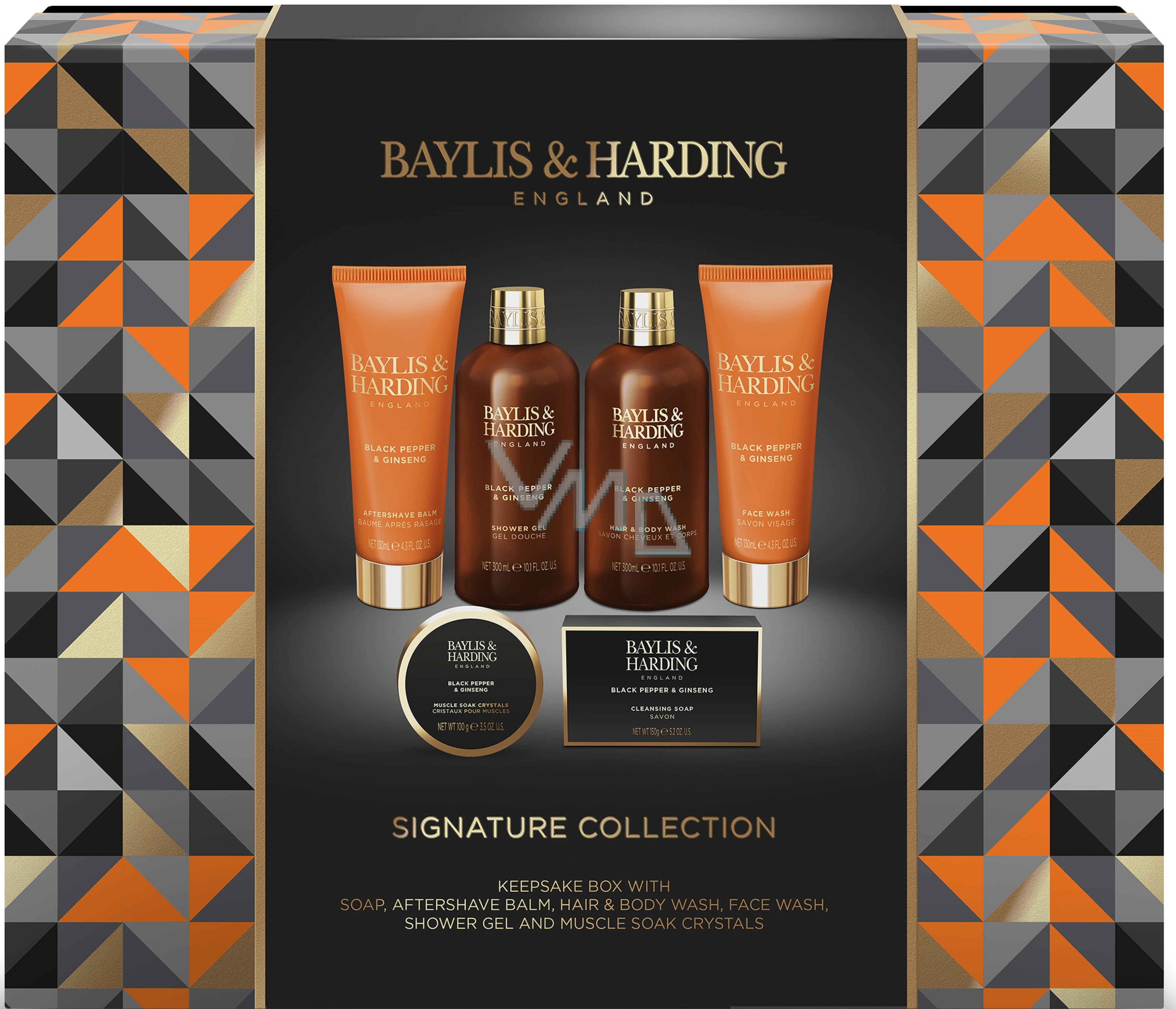 Baylis & Harding Men Schwarzer Pfeffer und Ginseng Duschgel 300 ml + After Shave Balsam 130 ml + Körper- und Haarwäsche 300 ml + Toilettenseife 150 g + Gesichtswäsche 130 ml + Badekristalle 100 g, Kosmetikset für Männer