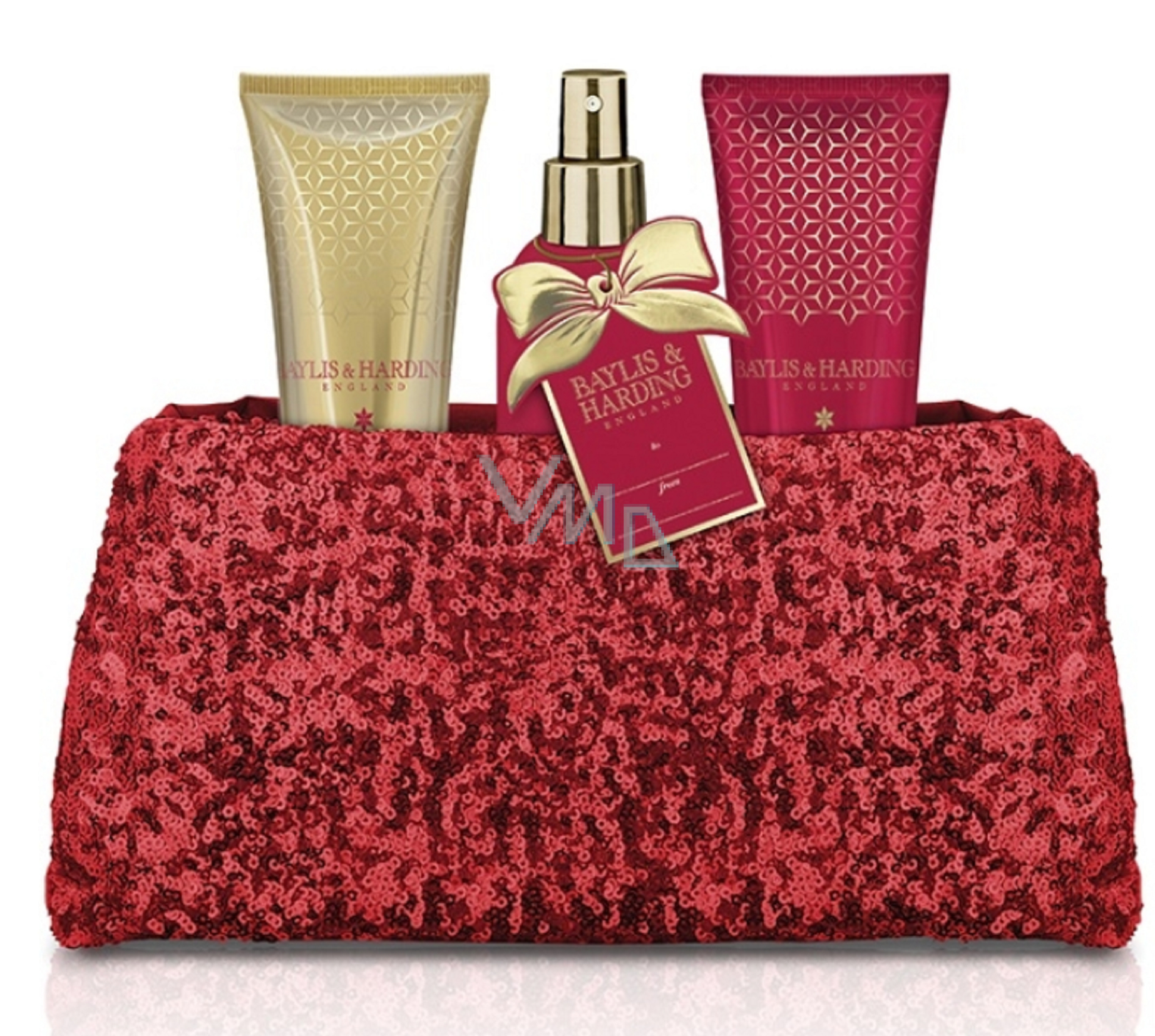 Baylis & Harding Feigen- und Granatapfel-Duschgel 100 ml + Hand- und Körperlotion 100 ml + Körperspray 100 ml + rote Paillettenhandtasche, Kosmetikset