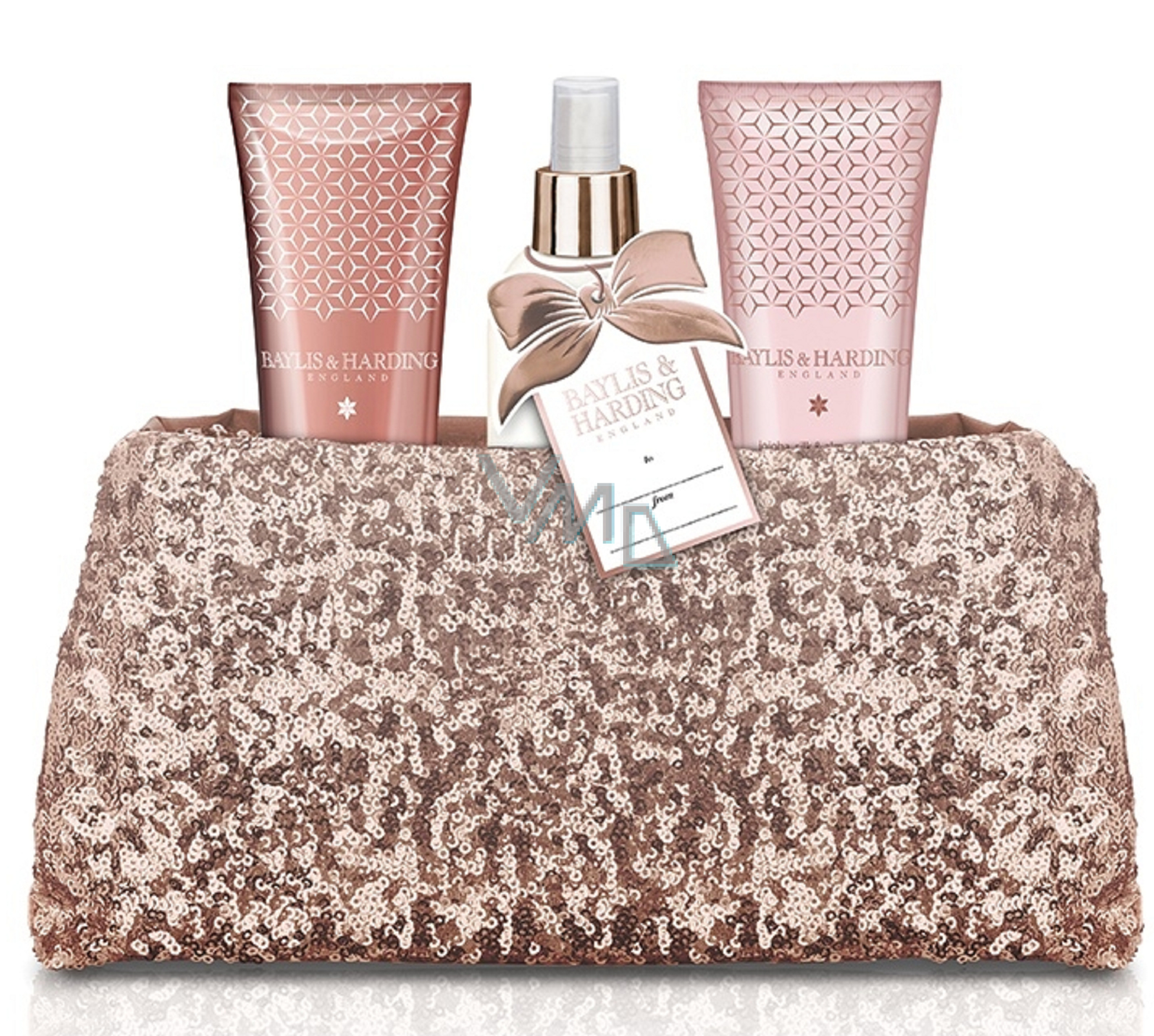 Baylis & Harding Jojoba-, Seiden- und Mandelöl-Duschgel 100 ml + Hand- und Körperlotion 100 ml + Körperspray 100 ml + pinke Paillettenhandtasche, Kosmetikset