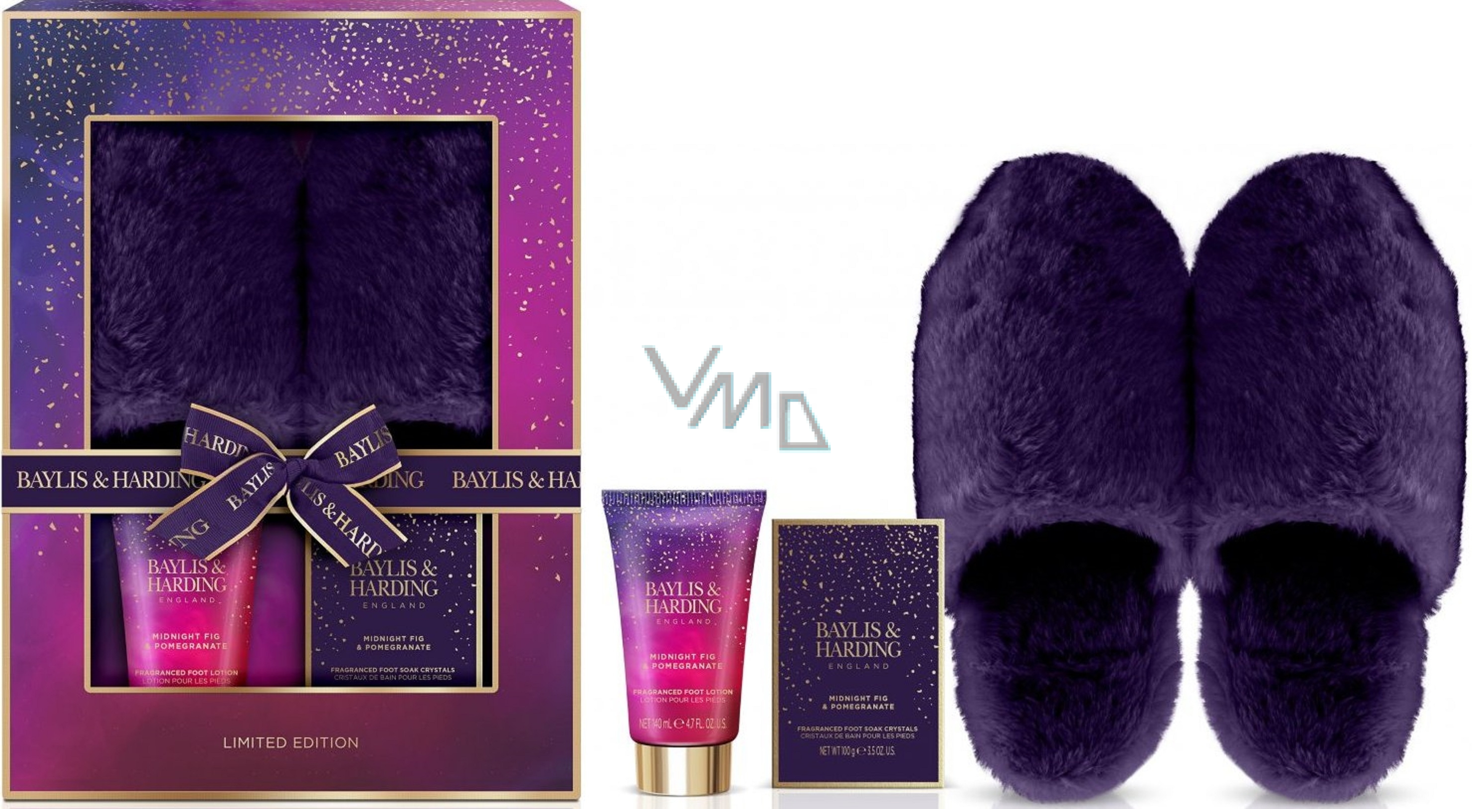 Baylis & Harding Feigen- und Granatapfelfußcreme 140 ml + Fußbadkristalle 100 g + Hausschuhe 1 Paar, Kosmetikset für Frauen
